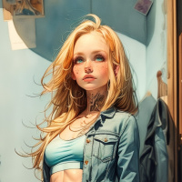 a young woman with blonde hair standing inside an open cabinet or locker. She has a slim build and is wearing