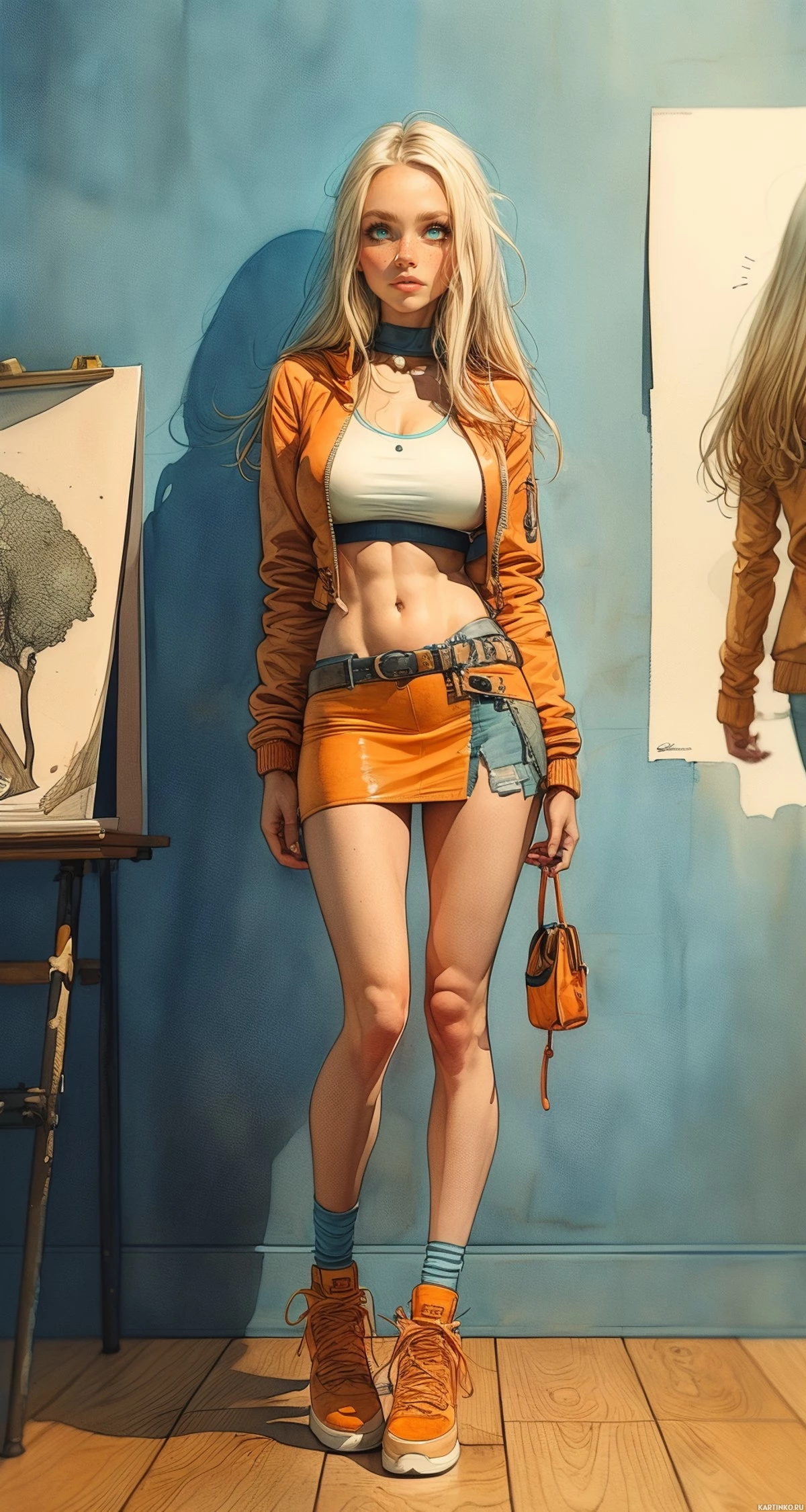 brown boots. To the left of the woman, there is an easel displaying a painting of a tree. In front of the woman, there is