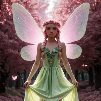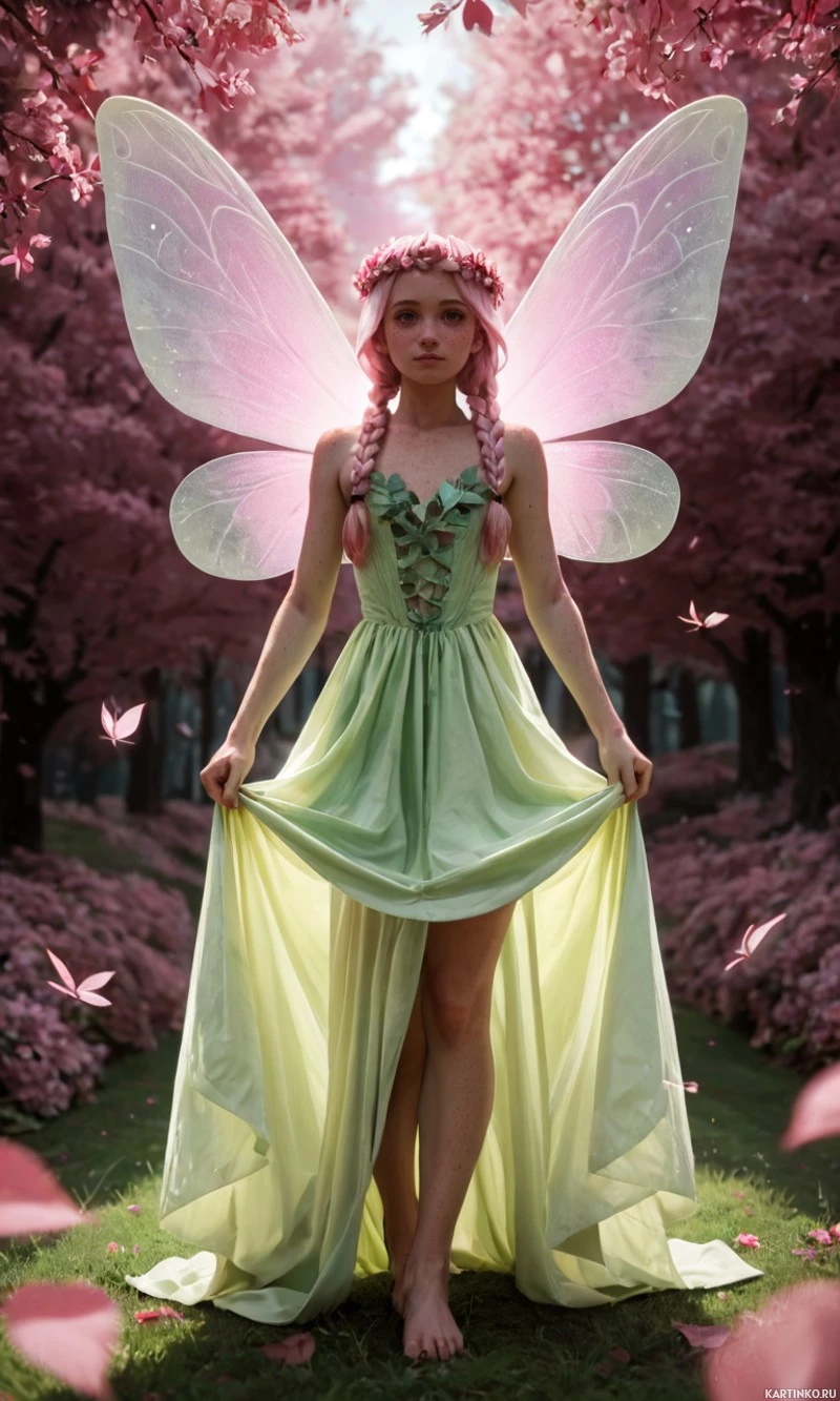 pink hair, which is styled in long, flowing locks. She has fairy-like wings attached to her back. Her attire consists of a long,
