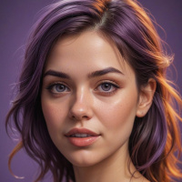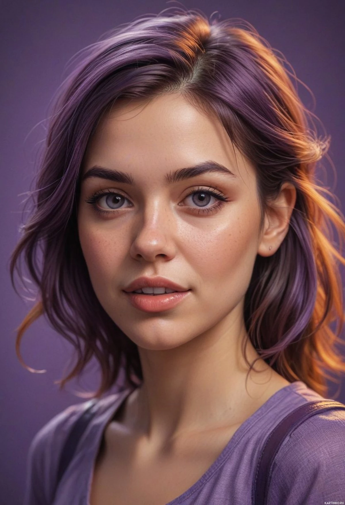 purple top, and there's a hint of a brown bag or accessory near her shoulder. Her gaze is directed towards the camera, engaging directly with the viewer. The lighting in the photo gives off