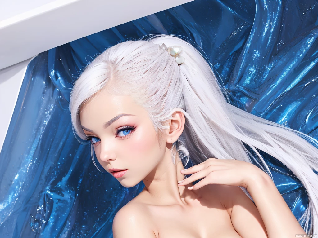 a female character with white hair styled in twin tails. She is posed as if she were floating, with one arm elegantly placed beside her head and the other hand gently resting on