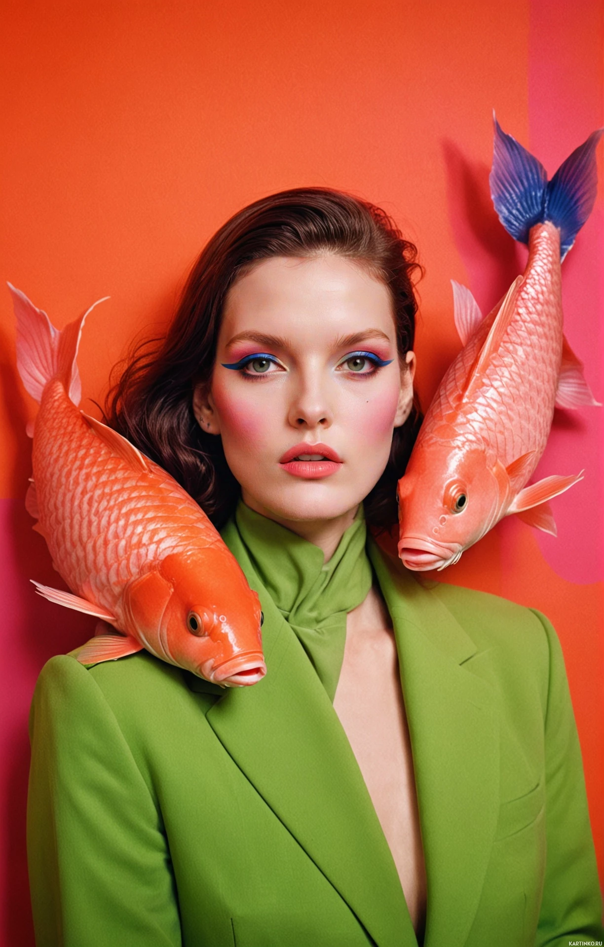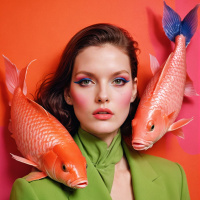 vivid colors and flowing fins. The overall style of the image is avant-garde and artistic, blending elements of nature (the fish) with