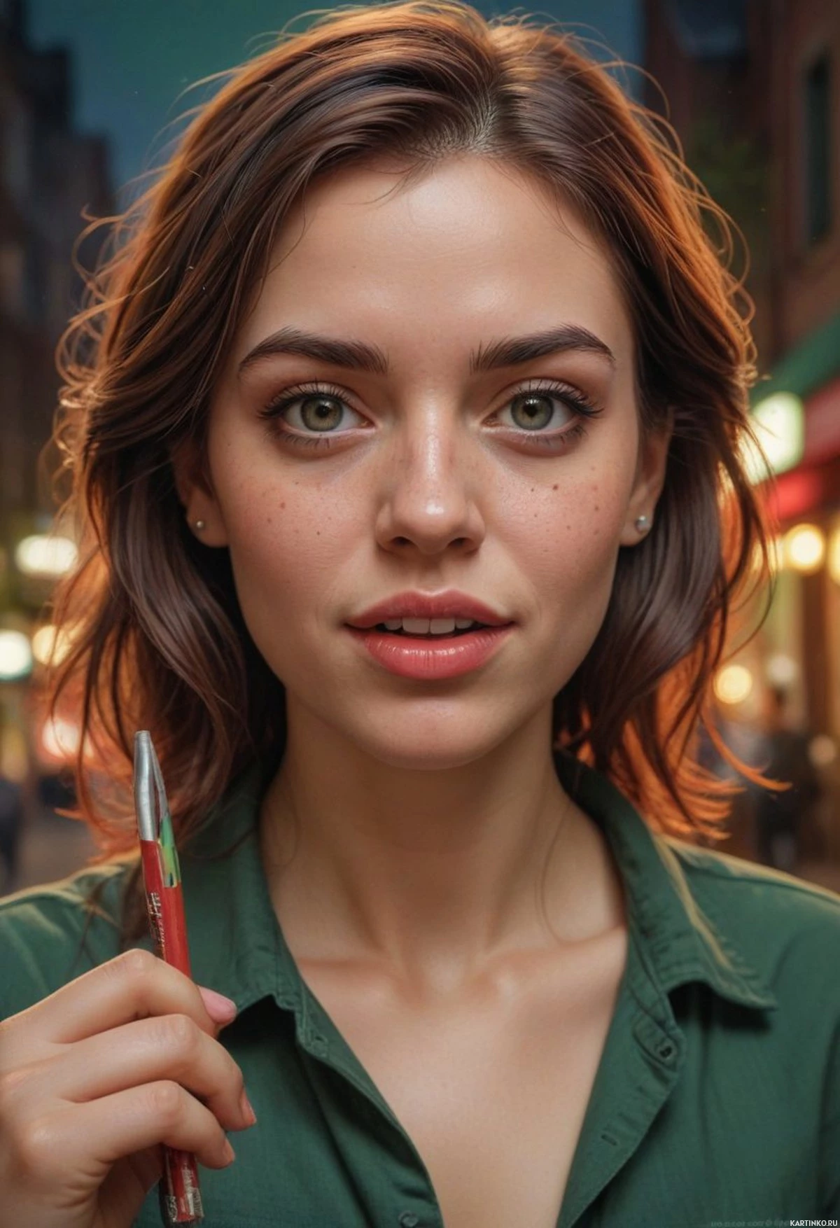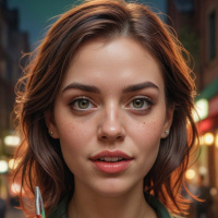 brown hair that frames her face, and she's wearing makeup that accentuates her eyes. The background is out of focus but suggests