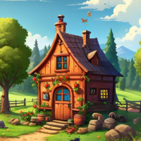 This is a digital illustration of a quaint fairytale-style house. The house features a rustic design with a sloped roof, pointed windows, and