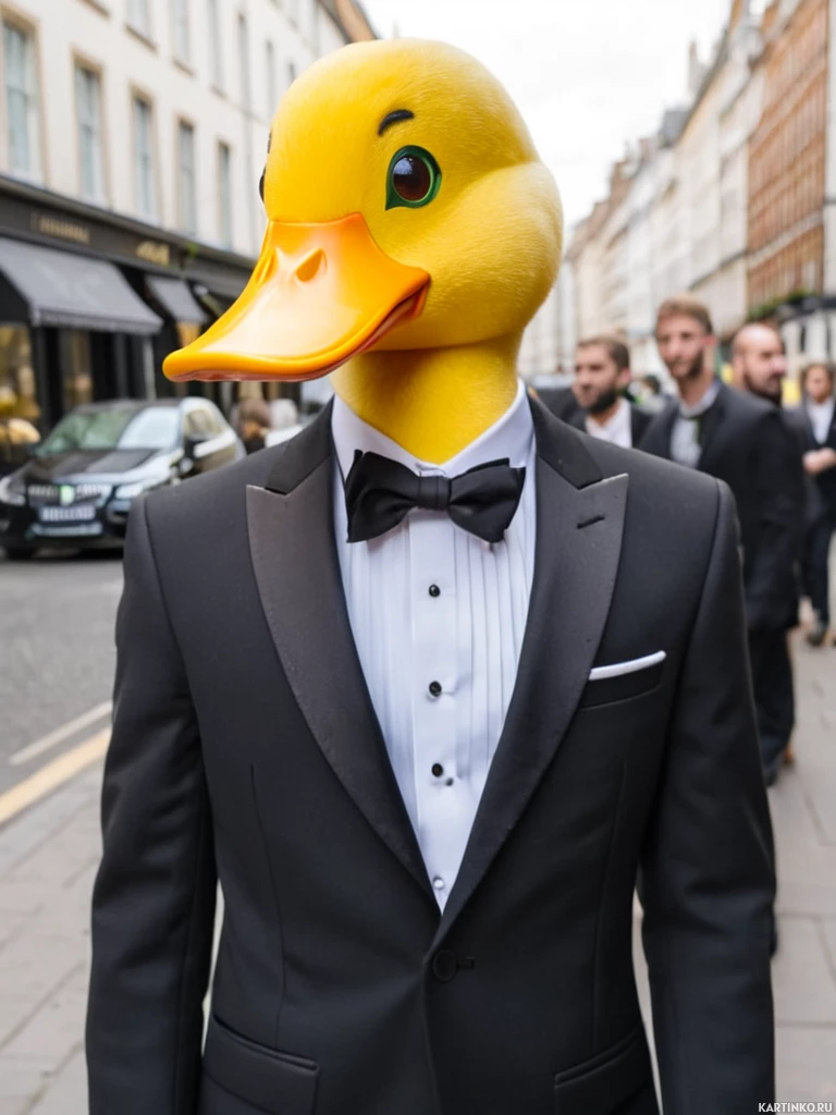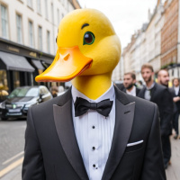 a duck mask. The duck mask covers the man's face, with its characteristic bill and