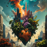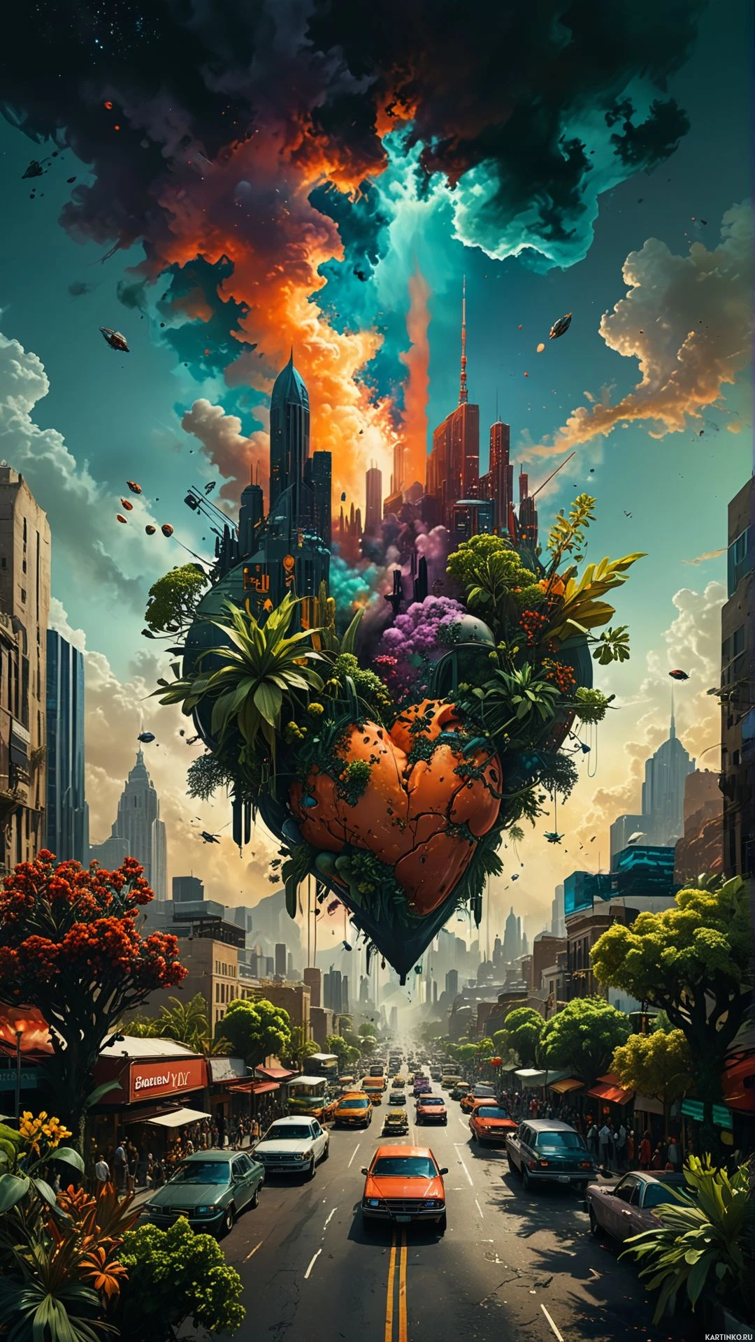 dark clouds and what appears to be flames or smoke emanating from the heart, contributing to the sense of chaos or distress. On either side of the heart are lush trees, one with red leaves and the other with green, adding a touch of nature amidst the urban environment. The color palette is rich and varied, with blues dominating the sky, contrasting against the warm hues of the city buildings and vehicles. The street itself seems to be located in the lower half of the image, with the heart taking up much of the upper portion. Overall, it's a compelling piece that combines elements of city life, environmental features, and the metaphorical representation of emotional distress through the central heart motif.