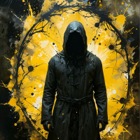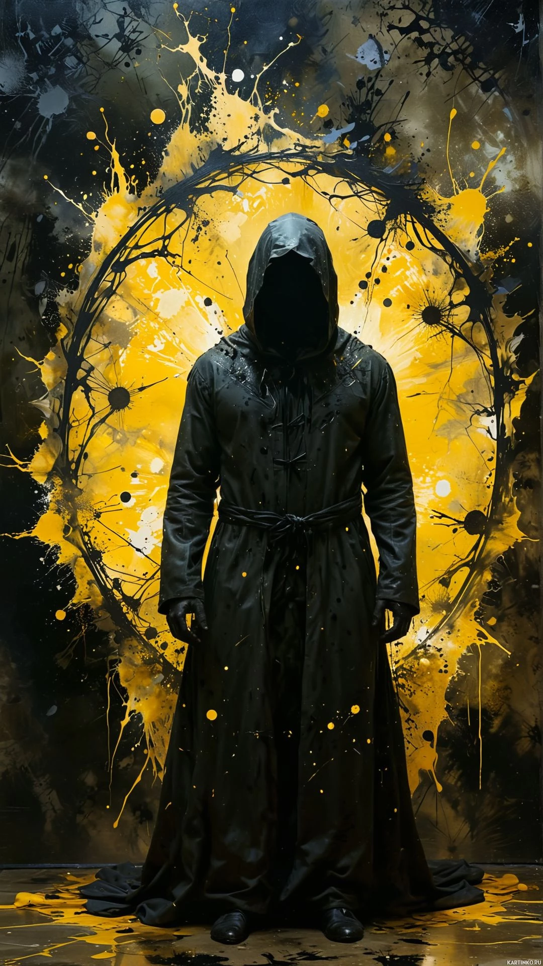 abstract splashes of light and color that give the impression of an explosion or intense energy release. The cloak's hood is a key element in this image, as it evokes mystery and adds to