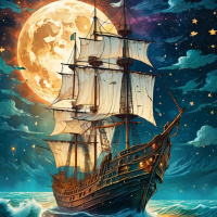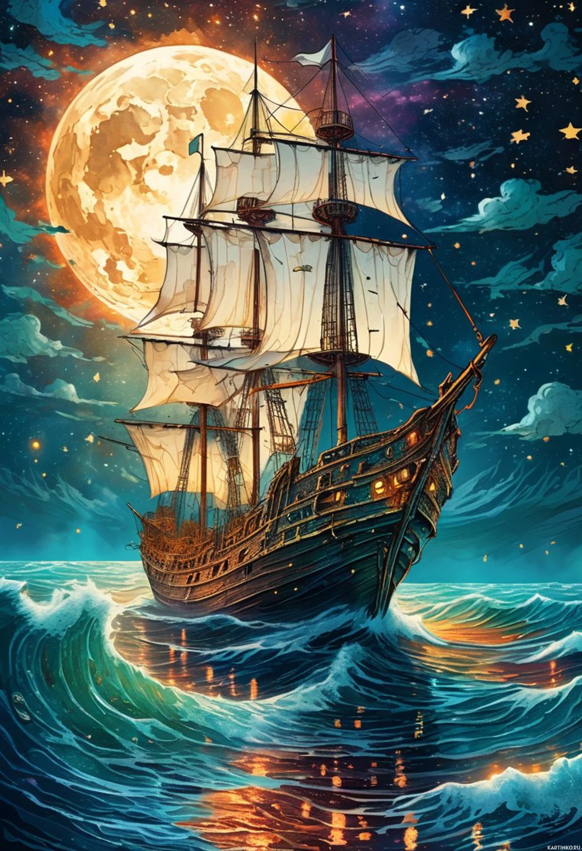 a full moon casting its glow over the ocean waves and onto the ship's sails. On