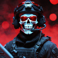 the dark attire, with red swirling patterns that might be intended to evoke energy, danger, or chaos, which could align with the intimidating aura created by the skull helmet. Please note that this description does not involve any