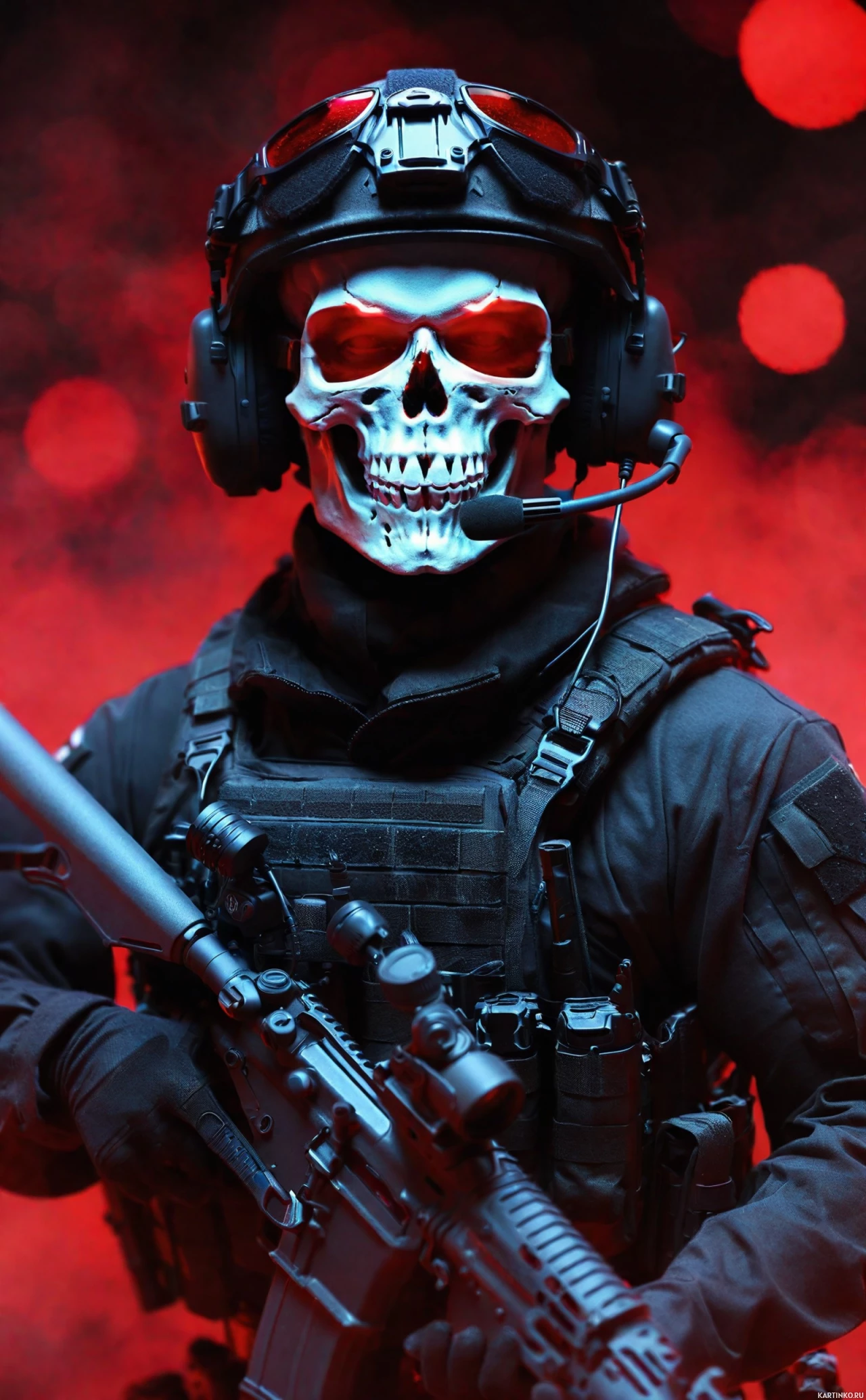 tactical gear and equipment. They are wearing a helmet that has a visor over the face, suggesting they may be in a combat or stealth role. The individual's head is obscured by the helmet, but there is a visible skull painted on it, which adds a menacing and intense appearance to the character. The person is holding two guns: one in each hand. These firearms are typical for