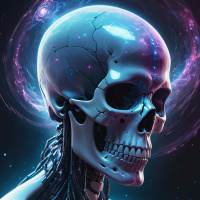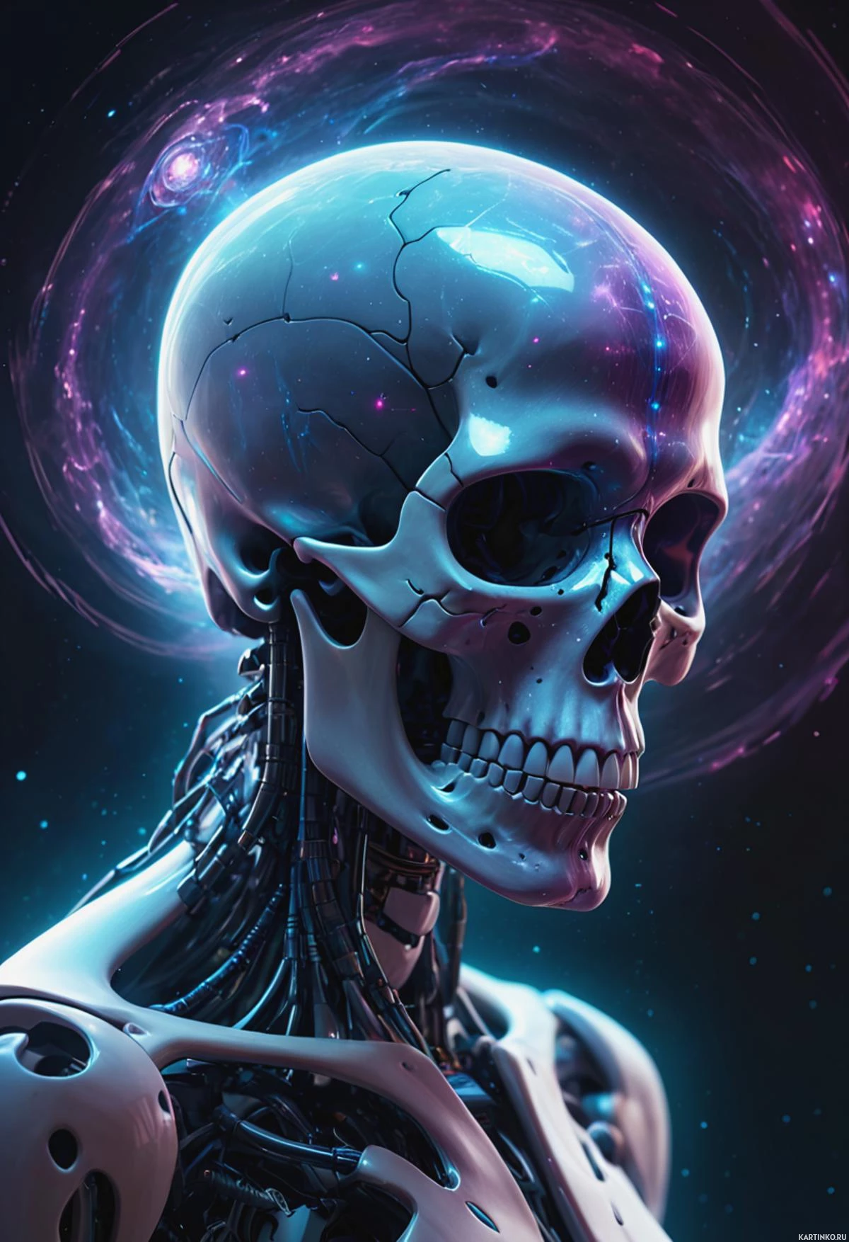 advanced technology, such as gears and circuitry visible through openings in the skull. Above the skull is a vibrant swirl of nebula-like patterns in shades of purple and blue against