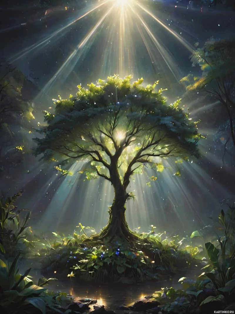 rays of light emanating from the center, illuminating the scene and casting a glow on the tree's branches and leaves. The colors used in the artwork are muted with a predominance of blues, greens, and grays, which contributes to