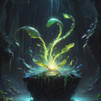 magical energy. The plant is central to the composition, with its roots reaching down into what appears to be