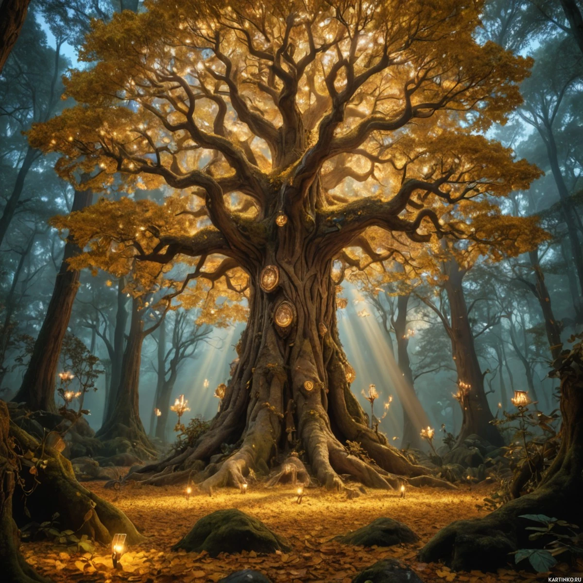forest scene with a large, ancient tree at its center. This central tree is adorned with small lanterns and
