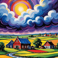 yellow orb breaking through the clouds towards the bottom right corner of the image. The foreground features a verdant field that transitions into a line of trees along the horizon. The scene conveys a sense of serenity and natural beauty, often associated with rural life or landscapes that are part of traditional folk art themes.