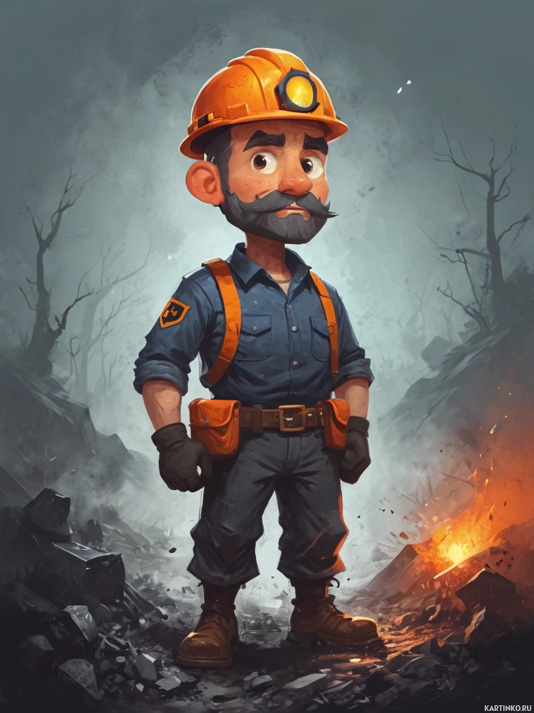 rough terrain around him, suggesting he might be at a construction or mining site. His pose and expression seem confident and alert. The setting is somewhat chaotic, with rocks strewn about and an area that looks like it has been affected by some sort of explosive activity, indicated by the presence of what appear to be burning embers. There are also dark, gnarled