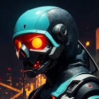 fiction setting. The character has a mechanical head with glowing