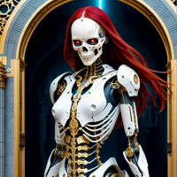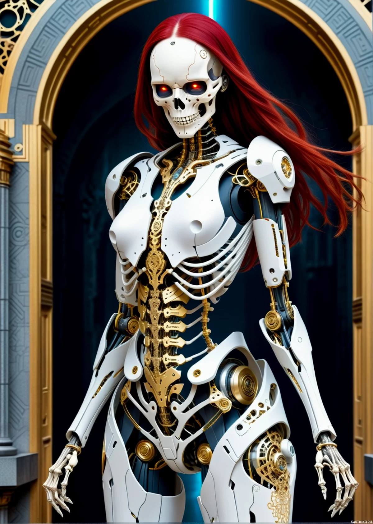 red hair contrasts sharply with its metallic skin, adding to the dramatic and otherworldly atmosphere of the image. The artwork is detailed and evokes a sense of fantasy and technological advancement in equal measure.