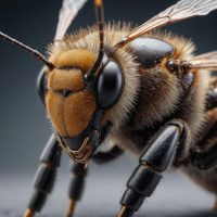 large wings and three smaller wings, along with a segmented body that includes the head, thorax, abdomen, and six legs. The bee appears to be resting on a surface. Bees are often associated with pollination activities, particularly for flowers, but they also play roles in other ecological functions such as decomposers of