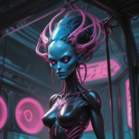 advanced technology, and the skin is not typical for humans, implying non-terrestrial origin. The attire appears to be a tight-