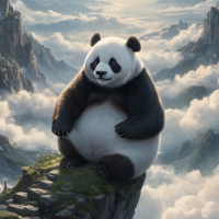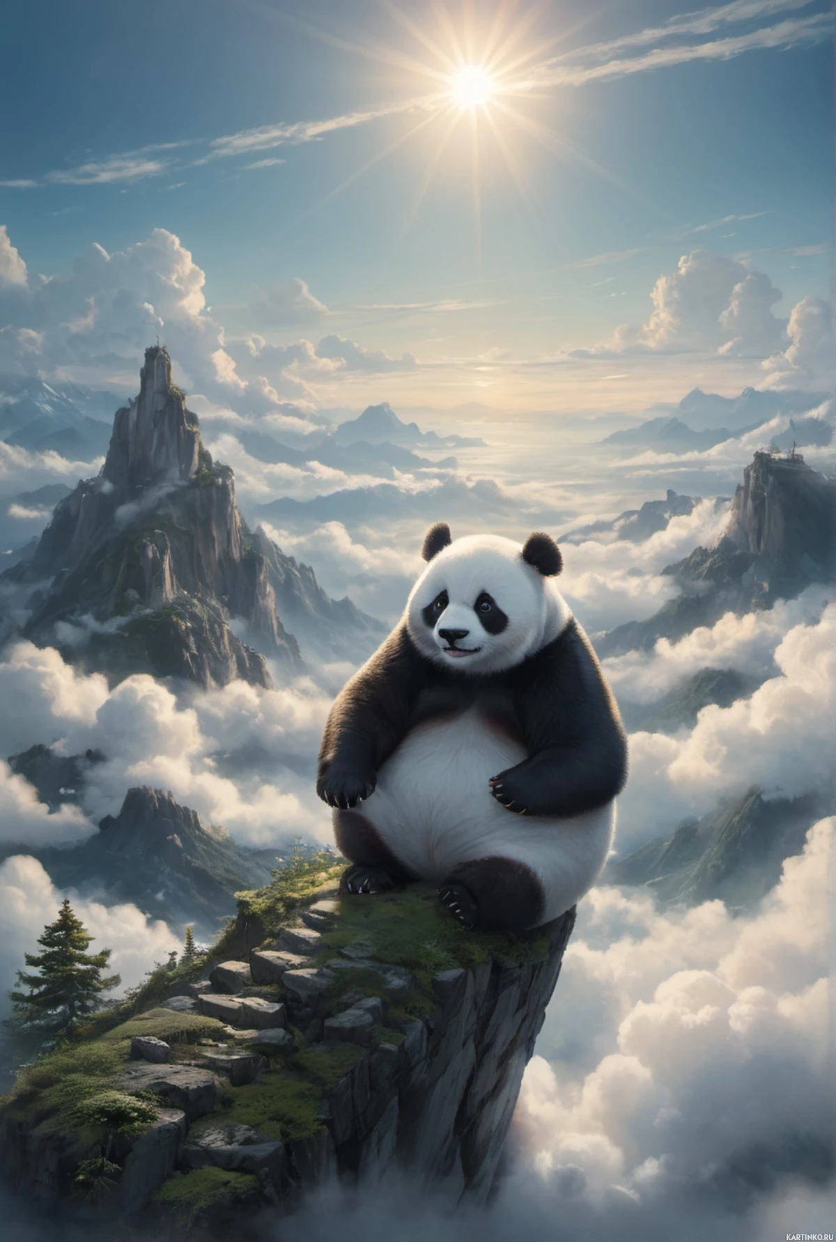 The image features an illustrated panda sitting cross-legged atop a cliff that appears to be floating in the sky. The panda is depicted with its arms crossed over its belly, exuding a peaceful demeanor. The background showcases a fantastical landscape with rolling clouds and distant mountains under a radiant sun.