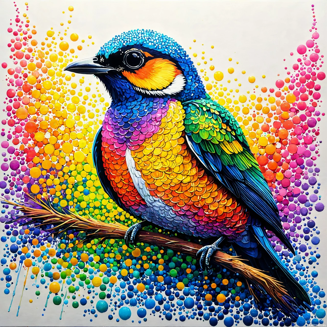 various hues creating a vibrant and dynamic atmosphere. In the center of this splashy backdrop is a bird perched on what appears to be a twig or branch. The bird has blue wings with