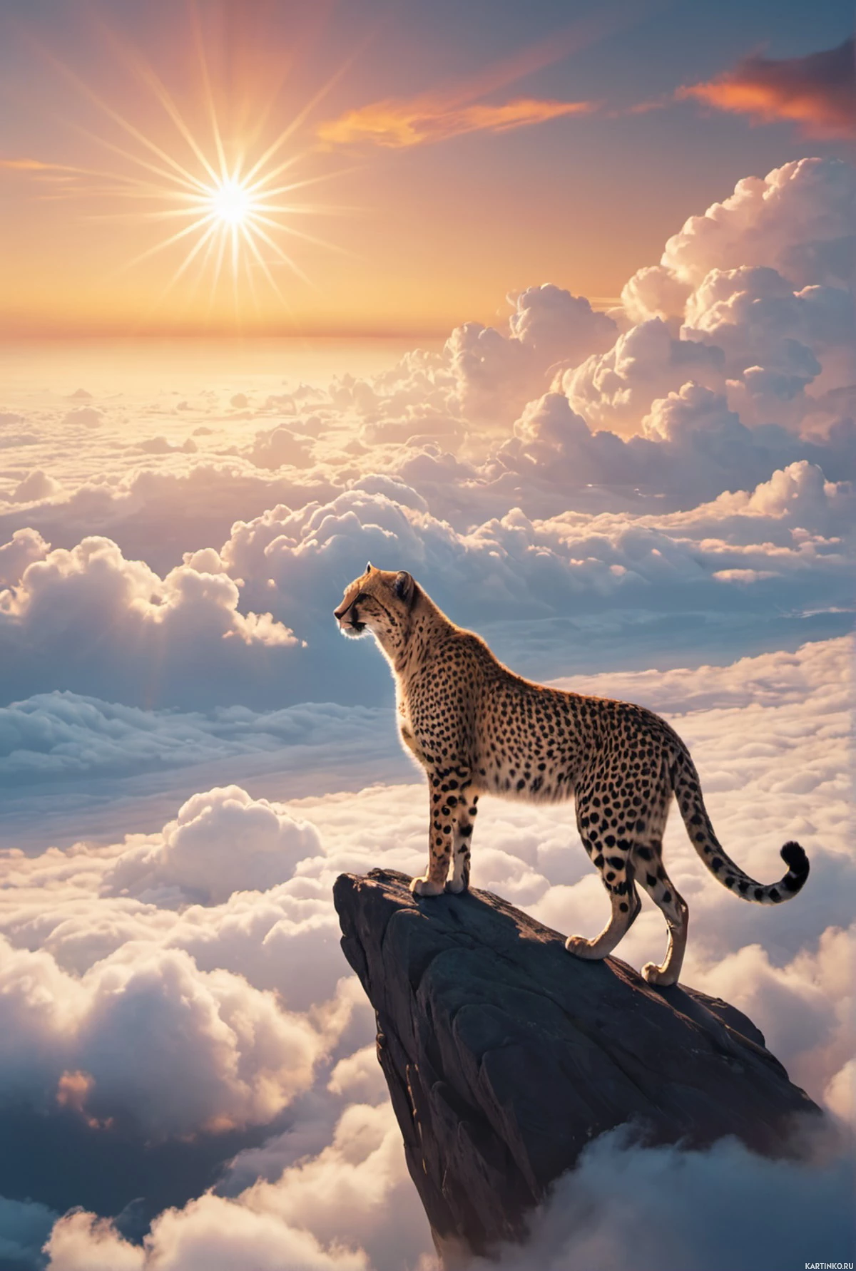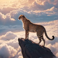 hues of orange, blue, and yellow, suggesting either the dawn or dusk hour. The cheetah appears alert and majestic in its pose. The overall atmosphere of the image conveys a sense of tranquility and