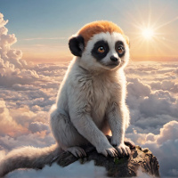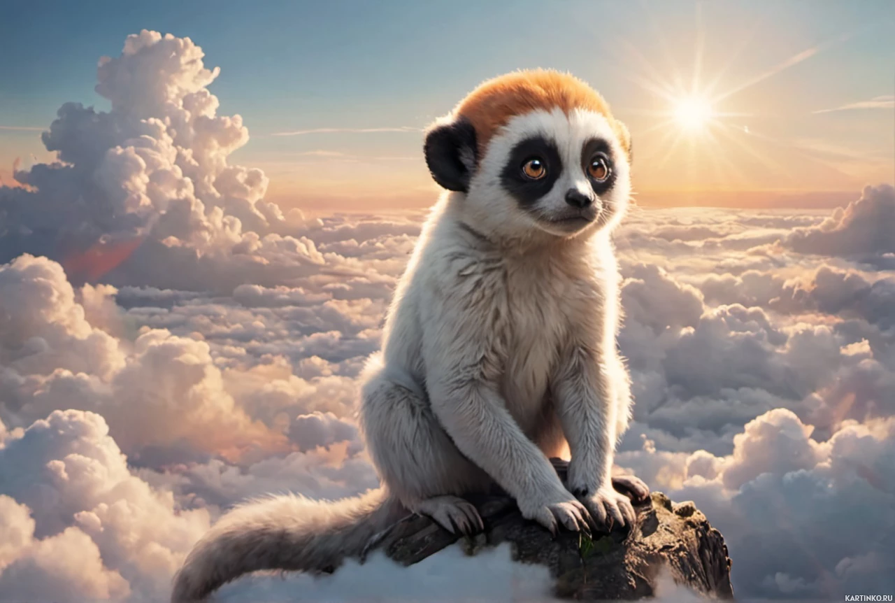 The image features a lemur, which is an animal native to Madagascar. The lemur is sitting on what appears to be a rock or ledge atop clouds, giving the impression that it's perched high up in the sky. The lemur has a gaze directed forward and its fur exhibits typical lemur patterns, including patches of