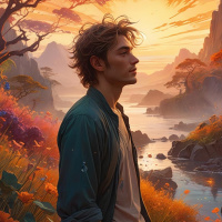 a blue shirt over a white t-shirt, and he appears contemplative or lost in thought. The artwork has a fantasy theme, indicated by the stylized cliffs,