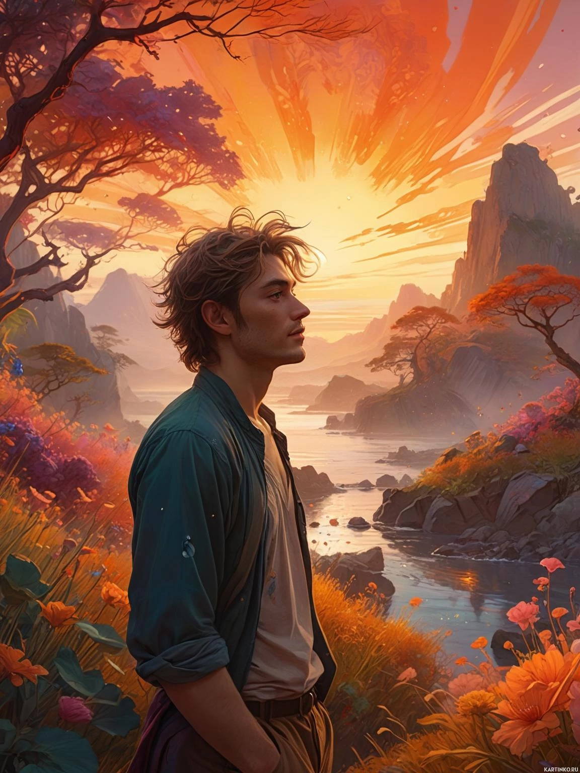 a rocky outcrop with a valley and towering cliffs in the background. He is gazing at a sunset, which illuminates a portion of the scene with