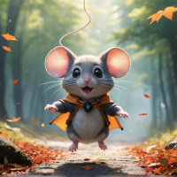 The image depicts an animated character, which appears to be a mouse. This character is wearing a cloak and is standing in a forest setting with trees around it. There are autumn leaves on the ground, suggesting the season is fall. The character is smiling and has its arms outstretched as if welcoming or embracing something.