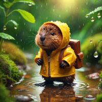 anthropomorphic animal resembling a chipmunk standing in the rain. The animal is wearing a bright yellow