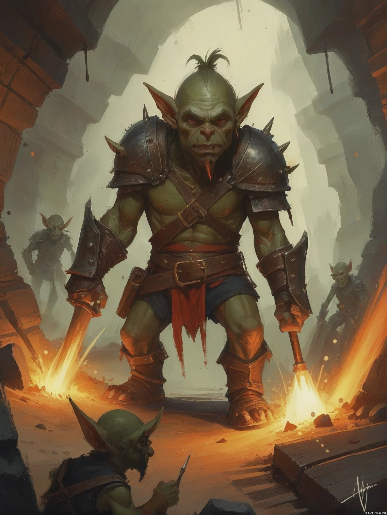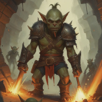 glowing effect. Behind the goblin, there appears to be a group of small, green creatures that might also be goblins, seated near what looks like