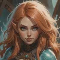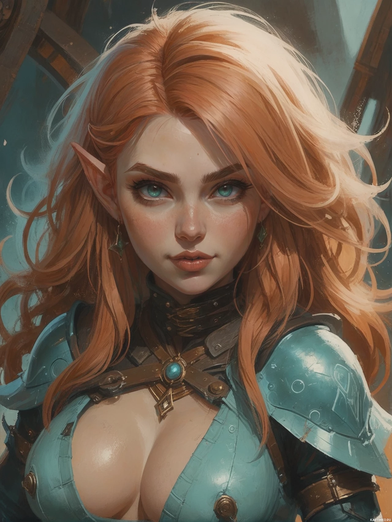red hair that cascades over her shoulders and is adorned with pointed ears indicative of her elven nature. Her facial features are expressive and detailed, with