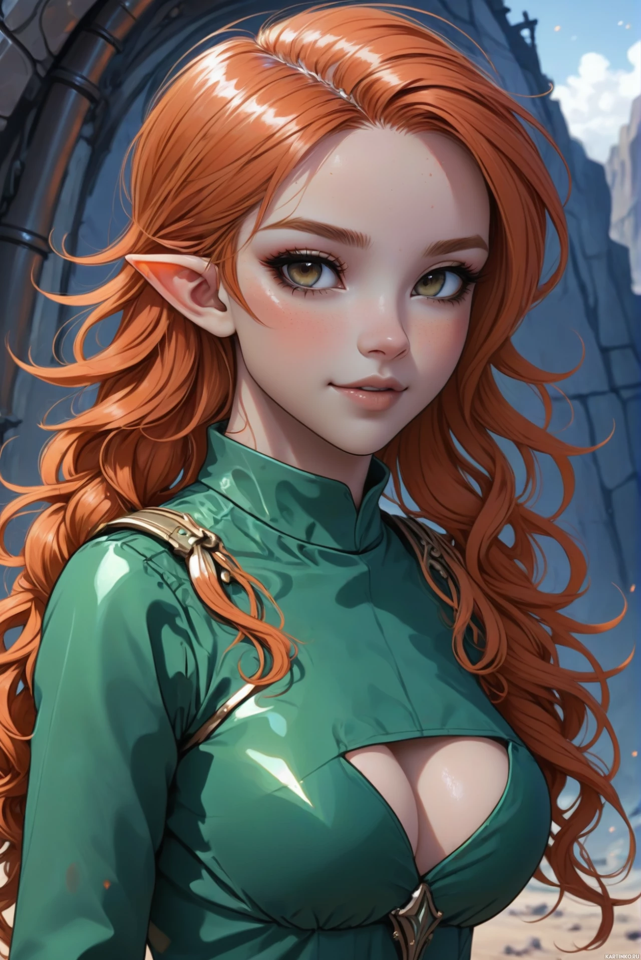 На картинке изображена девушка с рыжими волосами, уложенными в легкие волны, на фоне пейзажа, напоминающего сказочный мир, возможно, с архитектурой в средневековом или готическом стиле. На ней облегающая кожаная броня с видимыми ремешками и деталями, включая то, что похоже на заклепки по краям. Выражение лица нейтральное, с легкой улыбкой. У девушки заостренные уши, характерные для эльфов в фэнтези. Общий стиль картинки – реалистичный, с качеством цифровой живописи, что говорит о возможном происхождении из видеоигры или CGI-рендеринге, стремящемся к реализму.