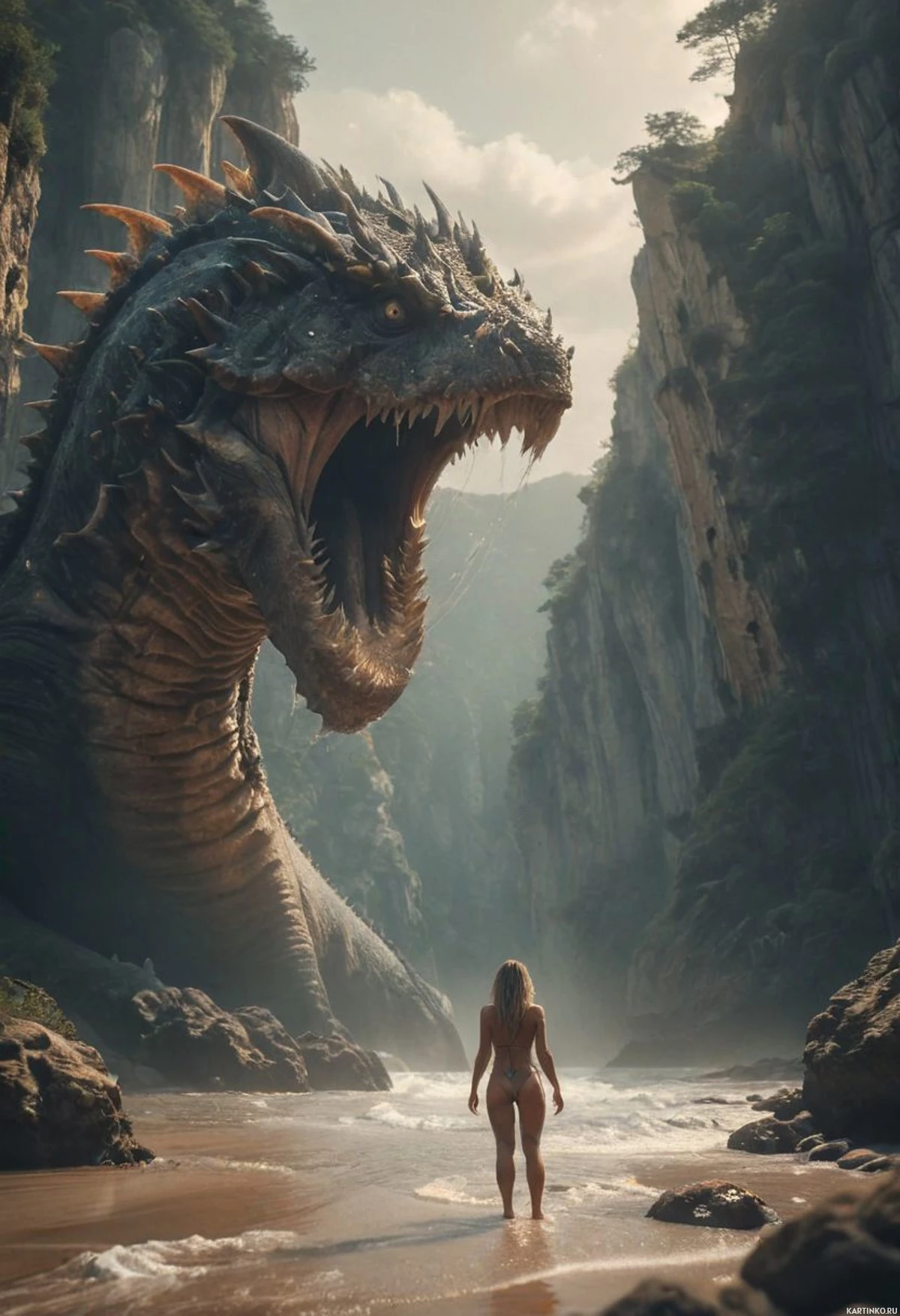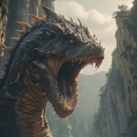 a fantasy scene with a large, serpentine creature that resembles a dragon. This dragon is situated within a narrow passage surrounded by