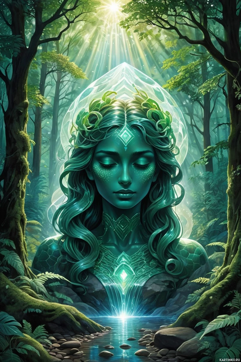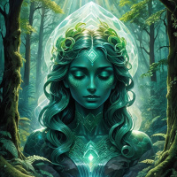 a mystical forest or grove, with trees and ferns surrounding the figure. There are also green crystalline structures that look like geodes, which add to the fantastical atmosphere. Above her head, there's a glowing light source, possibly representing a sun, moon, or some sort of magical luminescence, illuminating her face and highlighting her features. The overall ambiance is one of tranquility and otherworldly beauty.