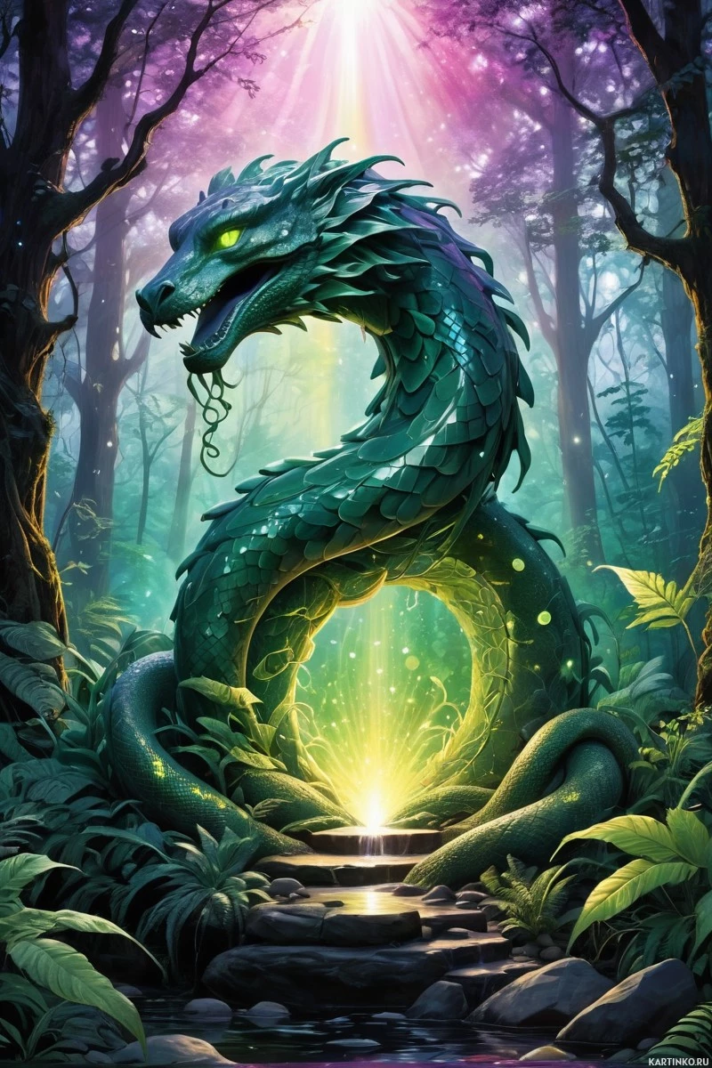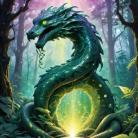 a fantasy scene with a prominent green dragon at its center. The dragon, which occupies most of the picture, appears to be in motion and is facing towards the viewer. Its mouth is open as if it's roaring or breathing fire. The background shows a forest setting with