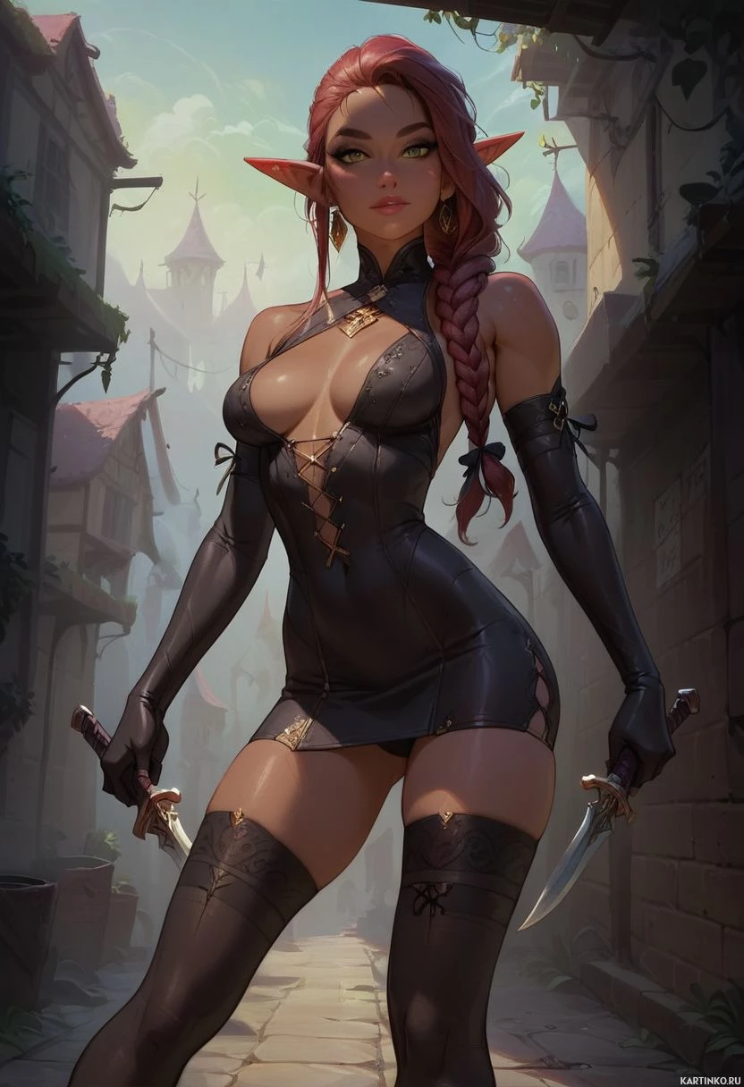 red hair and is adorned in black attire with gold accents, including what looks like leather or armor pieces and a corset. There's also a sword at her side. She stands confidently in the center of