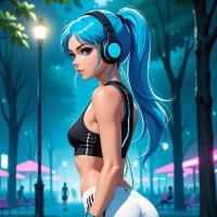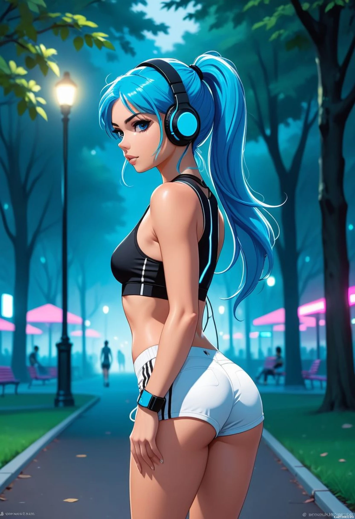 an athletic build, wearing a dark sports top and white shorts, along with what appears to be an electronic device on her ear. Her pose suggests confidence and self-assurance. In the background, there is