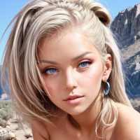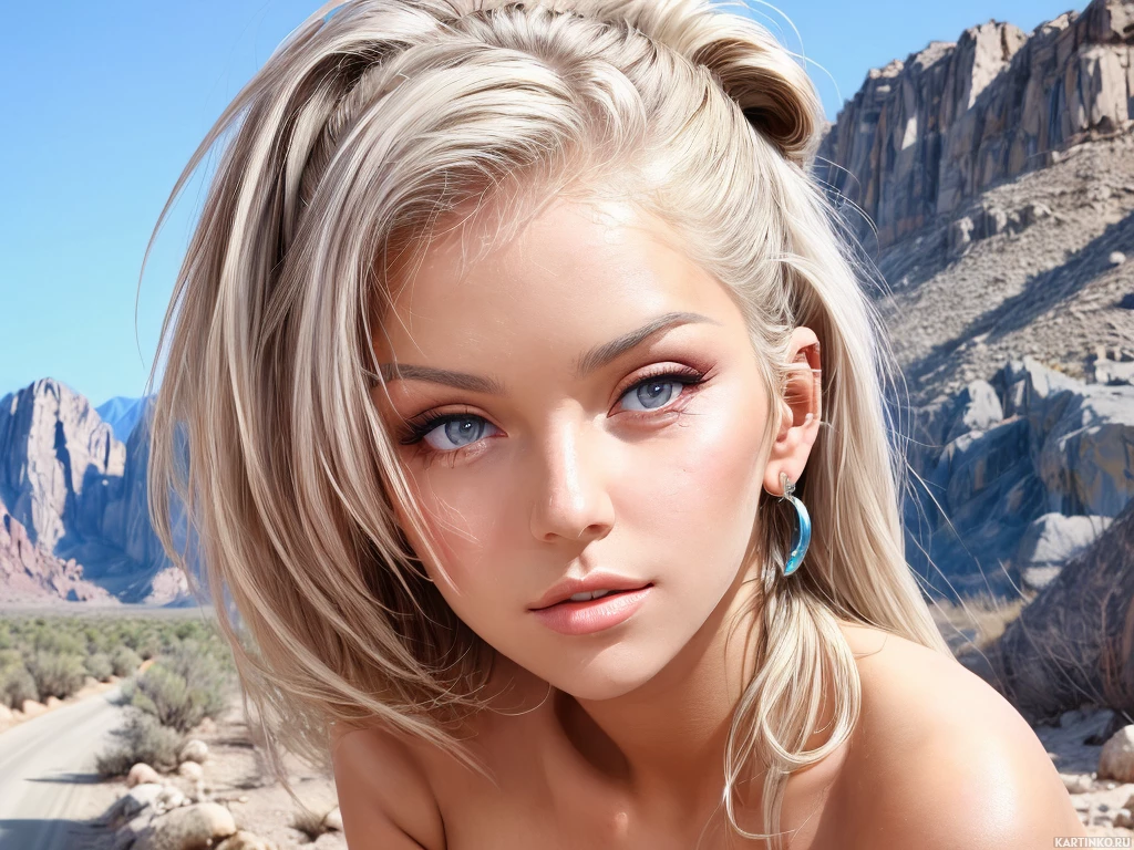 white hair and is wearing makeup that accentuates her eyes and lips. Her expression is neutral, and she appears to be looking directly at the camera. The background suggests a desert landscape with rock formations and clear skies, hinting at a high-fidelity,