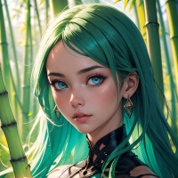 use of colors is harmonious, with the turquoise hair complemented by warm greens from the background environment. Overall, the image is rich in detail but also has a certain simplicity that allows the viewer to focus on the character's expression and the fantastical elements she embodies.