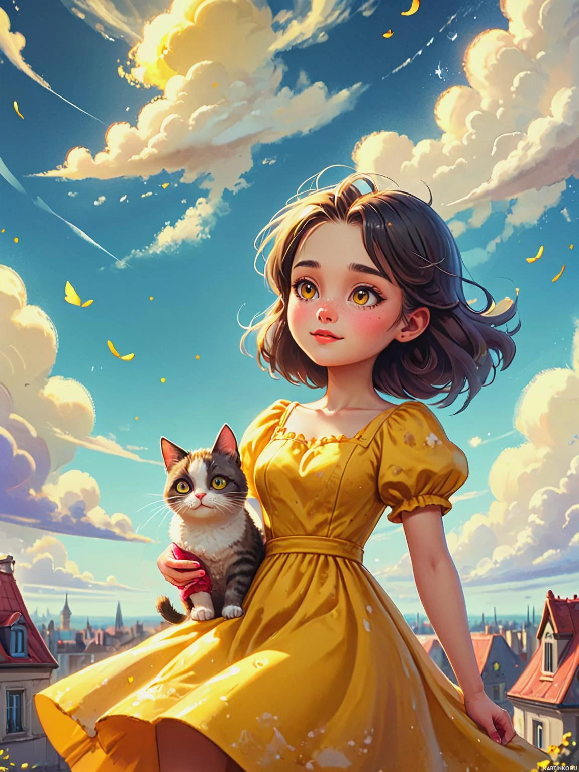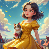 a yellow dress with floral patterns, and the background suggests an outdoor village setting with buildings that have European architectural style. There are clouds in the sky and what appears to be