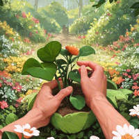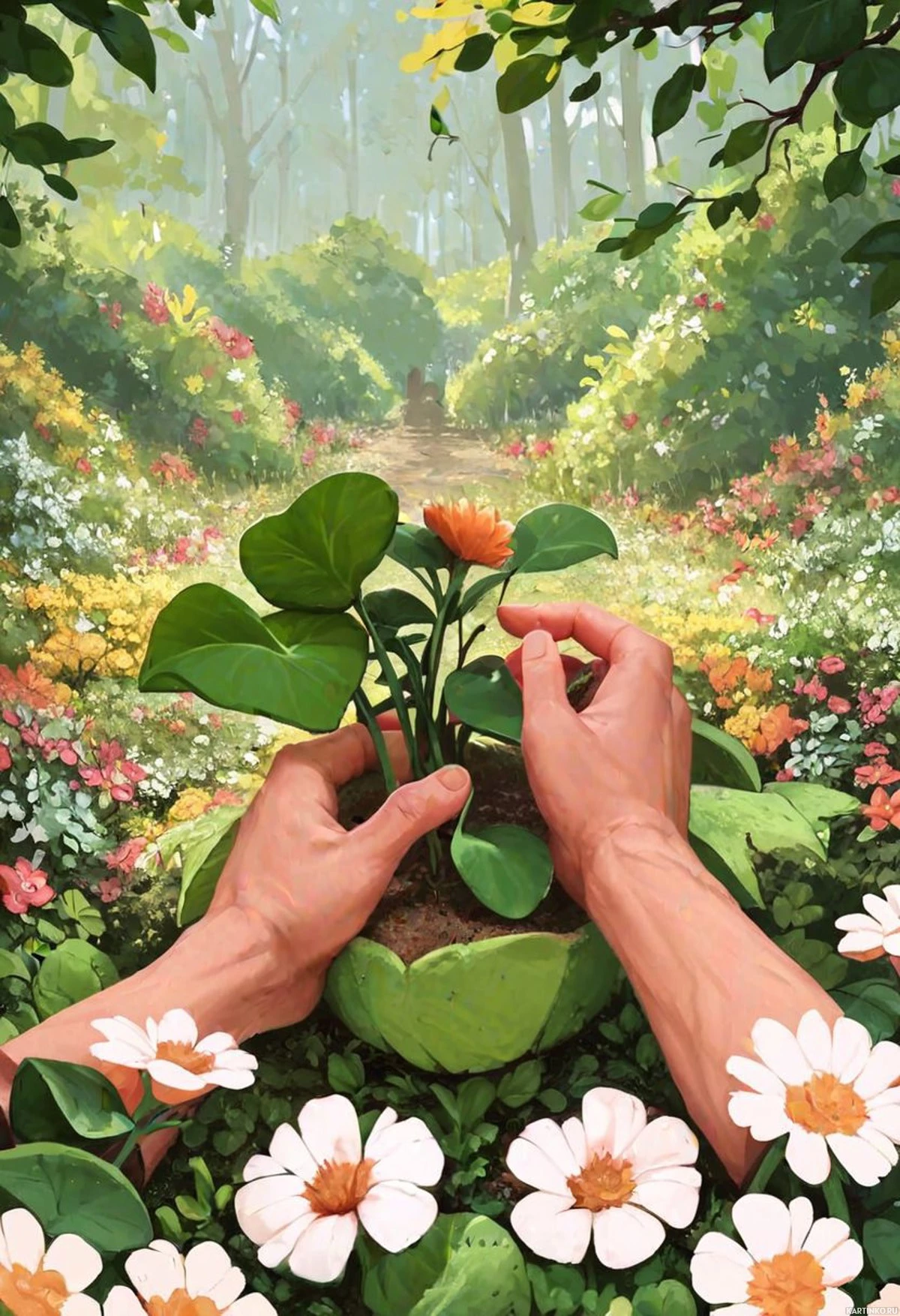human hands gently cradling a flower seedling in a pot, with both thumbs and forefingers touching the soil. The environment around the hands is lush and colorful, featuring