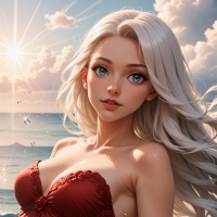 На картинке запечатлена молодая женщина с белыми волосами, стоящая на пляже на закате. У нее светлая кожа, голубые глаза, а волосы уложены в легкие волны, подхваченные светом заходящего солнца. Макияж выполнен изящно, подчеркивая черты лица. На ней красный купальник без рукавов с бантом сбоку, добавляющий образу игривости. На заднем плане — спокойный горизонт с пушистыми белыми облаками и намеком на океан на переднем плане. Общая атмосфера создает ощущение тихой и умиротворенной пляжной вечеринки.