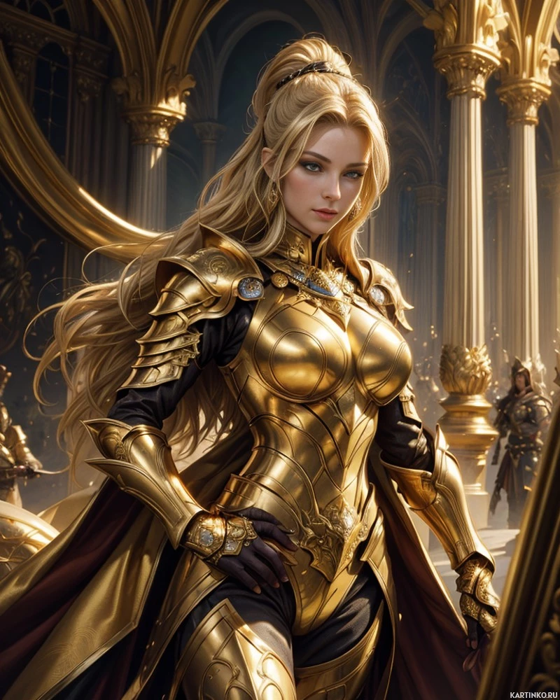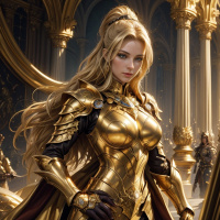 a golden armor with intricate details that suggest a high-quality craftsmanship, possibly indicating royalty or nobility. Around her neck, she has