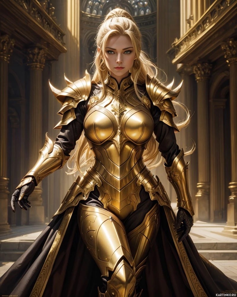 a female character dressed in ornate, golden armor with intricate designs. Her hair is blonde and styled back, and she has