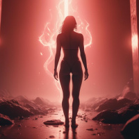На картинке изображена силуэт девушки, словно смотрящей на источник света или взрыв. Она стоит на каменистой поверхности, усыпанной обломками. Фигуру и пространство вокруг неё окутывает огненный фон, преимущественно в красных тонах. Общая композиция создаёт драматичное ощущение, возможно, передающее момент противостояния или испытания.