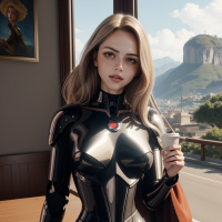 science fiction genres, such as armor design, futuristic fashion, and potentially a setting that hints at a sci-fi narrative.