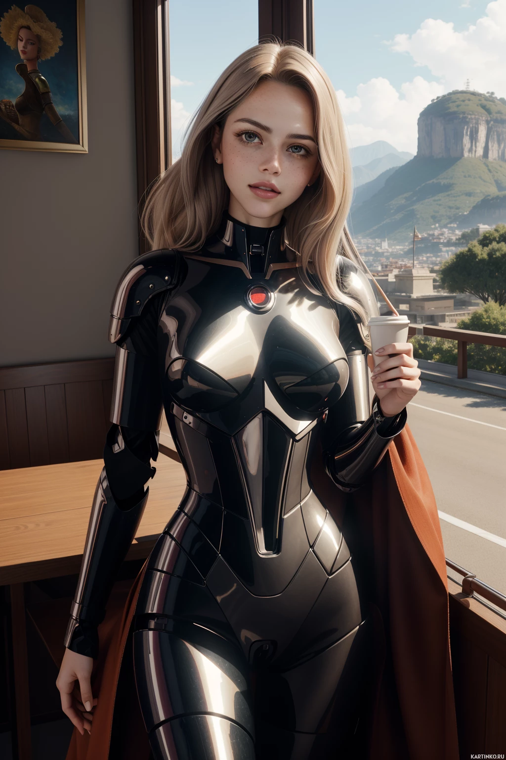 silver armor with a cape draped over one shoulder. She has long, wavy